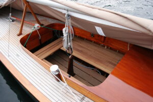 Arrow was originally named Calypso and was built in 1951 by Brodrene Roland in Norway and imported to the USA in 1956. Her original home port was the Richmond YC in Oakland, on San Francisco Bay. She remained in the San Francisco Bay area until 1983. She changed ownership in 1959, again in 1964 when she was moved to the Meridian YC in Berkley, CA and once more in 1971. in 1983 she was renamed Arrow and sold and moved to Seattle, WA. In 2006 she went through a major restoration on Shaw Island, WA by Peter Christsen and then in 2008 was sold and moved to Spokane, WA.